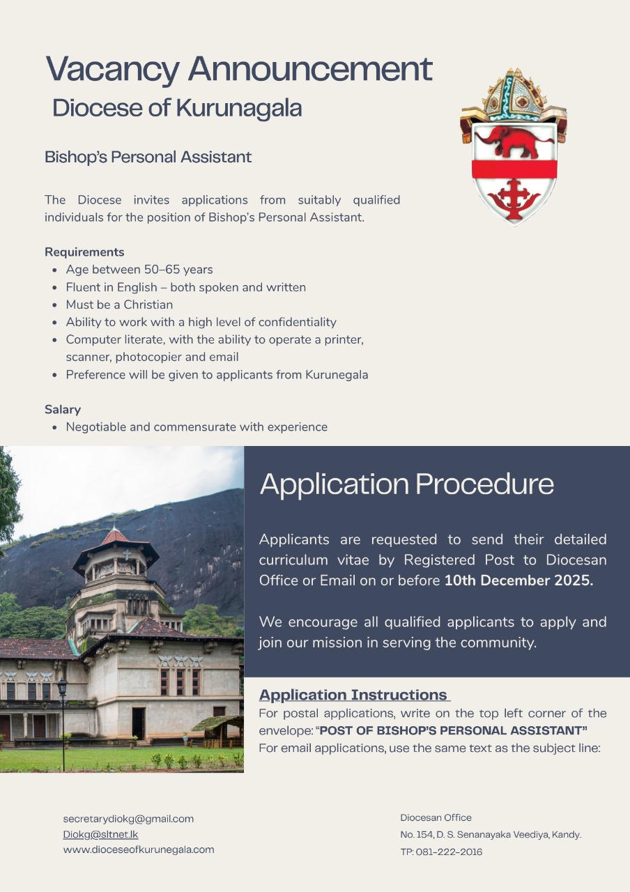 The Diocese of Kurunagala invites applications from suitably qualified individuals for the position of Bishop’s Personal Assistant. We seek a committed and responsible person who can support the Bishop in administrative, communication, and organizational duties with excellence and confidentiality.